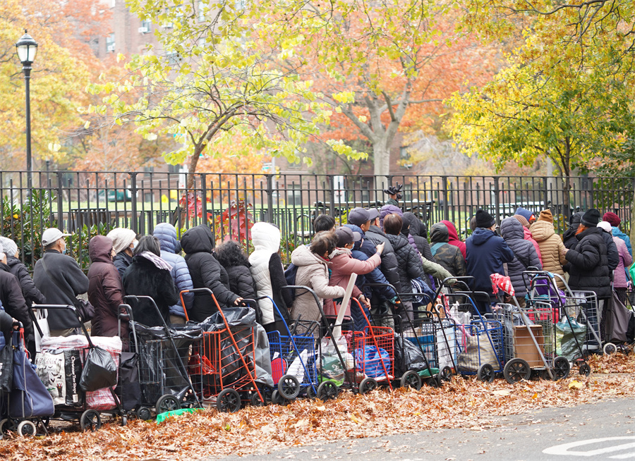美國紐約一處食物發(fā)放點人們在領取食物